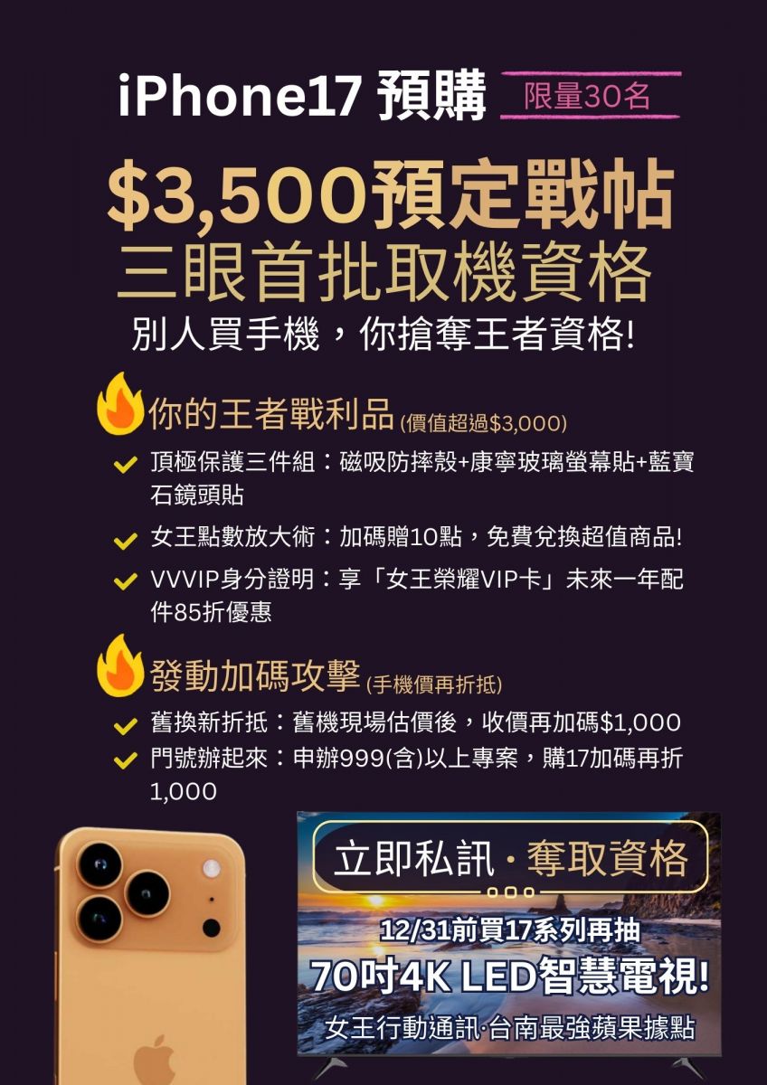 搶先預購iPhone17 贈點送好禮,還有機會帶走70吋 4K LED Google TV 智慧電視 | 台南買iPhone17,台南手機買賣,台南iPhone17無卡分期,台南空機買賣