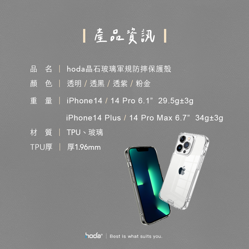 首頁 > 購物車總覽(隱藏) > 【殼】hoda iPhone14系列 晶石玻璃軍規防摔保護殼