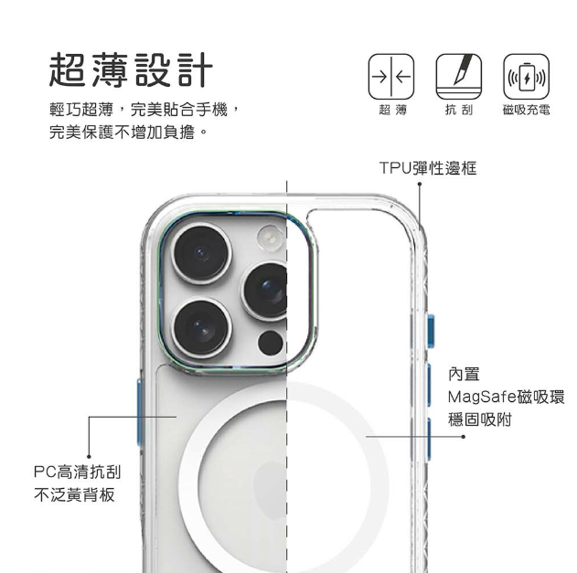 TPU彈性邊框+PC高清不泛黃背板雙重防護。